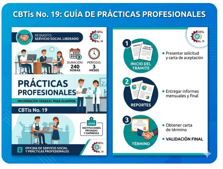 Las prácticas profesionales constarán de 240 horas, mismas que deberán cumplirse en un periodo de 3 meses. Estas se realizarán en instituciones del sector privado con las que el CBTis No. 19 tenga convenio. En caso de no contar con convenio, podrán realizarse en la oficina de vinculación, previa autorización correspondiente.